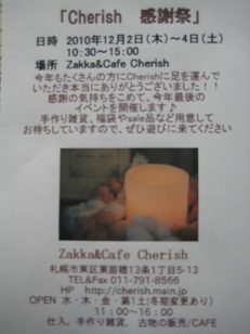 画像がぁぁぁhitomiちゃんごめんねぇ。。。今の私にはこれが限界ぃぃぃこちらは委託させて頂いている*Zakka&Kafe Cherish*さんです☆札幌市東苗穂13条1丁目5-13☆OPEN 水*木*金*第1土(冬期変更あり) 11時~16時古物の販売もしてますよ~オーナーのhitomiちゃんが作るパンやケーキは絶品これからの季節 降った雪でデコレーションされたお店の外観もこれまた可愛いですよ~そして店内。。。さらに。。。こんな感じで可愛いhand made雑貨に囲まれながら楽しく過ごせますよ~*****癒し空間Cherish*****(勝手に命名)もし良かったら。。。”RU-...”の消しゴムはんこ&キャンドルもご覧に成ってみて下さい!(私。。。一応。。。作家ですぅぅぅ)・・・とここまで来ましたが。。。ひど過ぎですね(汗) 写真&画像。。。勉強しまっしゅぅ~