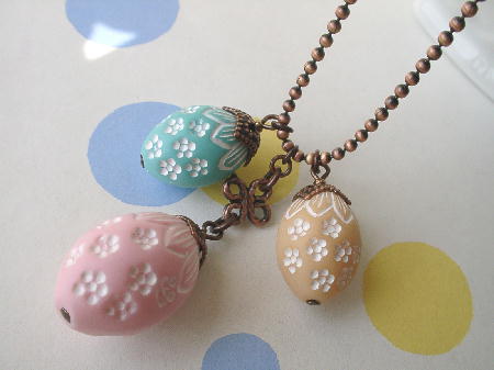 今週も慌ただしく一日一日が過ぎて行ってしまいます~~~。大半が講座のビーズキット&レシピ作り、後期のカリキュラム作り・・・なのですが、合間に自宅ビーズ教室がはいったりして、「あれ?」。。。と振り返ってみればもう木曜日!。いか~~~んっ!。本館ショップの新作アクセもプレビューのまま早10日が過ぎ・・・焦って今日頑張りました(笑)はい。先程、新作アップを済ませてきました。秋色のキュートなアクセが出来ましたのでぜひお時間がございましたら遊びにいらして下さいネ。*トップ画面、上の【クリスタルの風】リンクより飛んできてネ*こちらのネックレスもアップしておりますヨ。ドイツ製のVintageルーサイトビーズを使った木の実ネックレスです。座金をかぶせたら、すっかりドングリ☆。パステルカラーにハンドペイントの模様がステキなビーズなのです。マット加工が施されているので可愛すぎないところもお気に入りです。さて。新作アップも落ち着いたし。。。また講座のキット作りに励みます(笑)。*実は今・・・。あふれかえったビーズのデスクまわりをなんとかしよう~と考案中。(単に整理すればいいのだけど)。(それが出来ていれば悩まない)。まずは最近とみに増量中の天然石とシードビーズをなんとかしたいっ!。シードビーズはまだモノが小さいので種類や量が増えても難はない。。。だけど天然石はどうしたものか・・・。ううん。天然石の場合、大半が連で購入するので一種一カラーがかさばる。当然『単価メモ・購入先・石の状態』などメモしておくのできちんと(袋などで)わけておかないとダメだし・・・。うううん。整理が苦手~~~なんですヨ、私。でもチャンとしておかないと効率悪いですものネ・・・。今日からデスク周りを片付け&在庫の棚卸し(?)・・・をしたいと思います。・・・もし綺麗になったら(万が一なったら)写真撮影してワークスペースをオヒロメしちゃいますぅ♪。