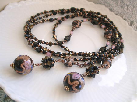 新学期が始まって・・・やっとゆっくりお仕事(ビーズ)に励めるようになりました。ビーズ講座の期の変わり目のこの時期、モーレツに忙しい~~~のです。10月はもうすぐそこ!だというのに下期の講座内容があまり決まっていません・・・。ううう。来週は自宅ビーズ教室もあるのでそちらの準備もしなくちゃ。ショップの新作も早く販売ページを完成させたいし・・・。そんな中キットの注文が90コも!。(10月までに作れるかナ~~~心配)。はうぅ~~~。頭がグルグルしちゃいます(笑)。が、頑張ろ・・・☆。*今日のビーズはこちら。ベネチアンのウェディングやアベンチュリン、スプリングルビーズなどをふんだんに使ったロングラリエットです。頼まれ物の一点物です。お嫁入りを済ませてしまったのでもう手元にもないのですがとてもいい感じに仕上がりました。自分の分も作りたいナ~と思って画像を残しておいたのです。いずれ材料が揃ったら・・・。むふ♪♪♪。この秋冬はジェットが流行なのでたくさん使って下さると嬉しいナ。さて。これからヤフオクに出品+落札されたメゾピアノのお洋服を郵便局へ発送しにいかなくちゃ~☆。
