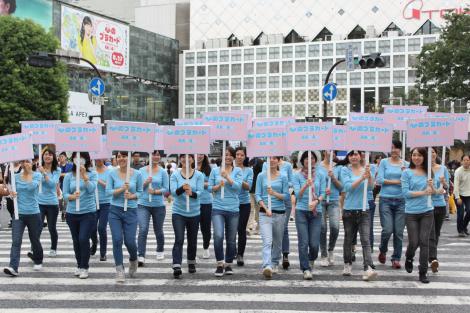☆人気アイドルグループ・AKB48が27日、37枚目のシングル「心のプラカード」を発売し、東京・渋谷駅周辺で発売記念イベントが開催された。正午すぎ、渋谷駅前のスクランブル交差点に突如、「ピアノができるようになりたい」「UKに行きたい」といった本音を綴ったプラカードを掲げた女性20人が出現。2列に整列して行進すると、物珍しさに通行人が写真撮影するなど大賑わいを見せた。 渋谷パルコ公園通り広場には、総選挙上位3人の渡辺麻友・指原莉乃・柏木由紀の等身大パネルも登場し、疑似2ショットを撮影できる「なんちゃって2ショット写真会!」を実施。吹き出し入りの2ショットのポラロイド写真に、ファンは「今度ケーキ食べにいこ!」「いいね!」といったメンバーとの「なんちゃってトーク」を書き込んで楽しんだ。 同所にはほかに、まゆゆが同曲のMVで着用した衣装や、音楽番組で高橋みなみが実際に使用した直筆の「激ヤセ否定」プラカードなど、ファンならずとも楽しめる品々を展示。集まったファンや通行人から「本物?」「すごい!」といった歓声があがっていた。