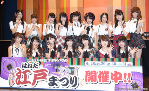 ☆AKB48の渡辺麻友、柏木由紀らが28日、東京・羽田空港国際線旅客ターミナル内にオープンした多目的ホール「TIAT SKY HALL」でこけら落とし公演を行った。同ホールの初日を飾った渡辺は「初めてこけら落とし公演をやらせていただけて光栄」と目を輝かせ、柏木は「すごく使わせていただく場所なので、恩返しになったかはわからないですけど、スタートに携わることができてうれしい」と喜んだ。 同公演には渡辺、柏木のほか、岩立沙穂、木崎ゆりあ、北原里英、鈴木まりや、高城亜樹、田野優花、土保瑞希、西野未姫、野澤玲奈、平田梨奈、峯岸みなみ、向井地美音、村山彩希、横山由依の計16人が出演。 招待された地元の小学生や関係者ら、いつもとは異なる観客を前に、新曲「心のプラカード」(27日発売)のほか、「フライングゲット」「ラブラドール・レトリバー」「恋するフォーチュンクッキー」「ポニーテールとシュシュ」「ヘビーローテーション」の全6曲を披露した。 商業施設を拡張した同ターミナルでは、全長約25メートル・総檜造りの「はねだ日本橋」、航空関連の資料展示やフライトシミュレーターを体験できる「TIAT Sky Road」、和の銘店が並ぶ「おこのみ横丁」など新たな施設や店舗が28日正午からオープン。公演前、実際に見学したというメンバーは「お侍さんや忍者が普通に歩いていて話しかけてくるのでテンションが上がった」(峯岸)、パイロットの操縦体験がすごくリアル」(渡辺)とはしゃいでいた。 同所では31日まで『はねだ江戸まつり』(入場無料)を開催中。
