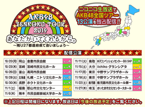 ☆既に発表されていた「AKB48全国ツアー2014 あなたがいてくれるから。~残り27都道府県で会いま しょう~」の10月の岡山・宮崎・富山・北海道・長野 の5公演に続き、11月の福島・熊本・鳥取・大分・東京2公演、鹿児島、埼玉の8公演を ニコニコ生放送で配信することが追加決定致しました!ついに年内完結「全国制覇」に向けたAKB48の公演をパソコン、スマートフォン、タ ブレットで堪能しよう! 【配信スケジュール】▼10/20(月)岡山 倉敷市民会館 チームA 放送日:10/21(火) 20:00~23:00 ▼10/23(木)宮崎 宮崎市民文化ホール チームK 放送日:10/23(木) 17:00~20:00(生中継)▼10/26(日) 富山 高岡市民会館 チームA 放送日:10/27(月)20:00~23:00 ▼10/28(火)北海道 札幌・ニトリ文化ホール チームB 放送日:10/29(水)20:00~23:00 ▼10/30(木)長野 ホクト文化ホール チームK 放送日:10/31(金)20:00~23:00★追加決定★ ▼11/1(土)福島 郡山市文化センター チーム4 放送日:11/1(土) 16:00~19:00(生中継)▼11/6(木)熊本 市民会館崇城大学ホール チームB 放送日:11/7(金) 20:00~23:00 ▼11/11(火) 鳥取 米子コンベンションセンター・BiG SHiP チームK 放送日:11/12(水)20:00~23:00 ▼11/15(土)大分 iichikoグランシアタ チーム4 放送日:11/16(日)20:00~23:00 ▼11/17(月)東京 中野サンプラザホール チームA 放送日:11/17(月)17:00~20:00(生中継)▼11/18(火)東京 中野サンプラザホール チームA 放送日:11/19(水)20:00~23:00 ▼11/22(土)鹿児島 鹿児島市民文化ホール第一 チームB 放送日:11/23(日)20:00~23:00 ▼11/27(木)埼玉 さいたま市文化センター大ホール チームA 放送日:11/28(金)20:00~23:00 ※冒頭1時間は各チームの楽曲、ミュージックビデオを配信致します