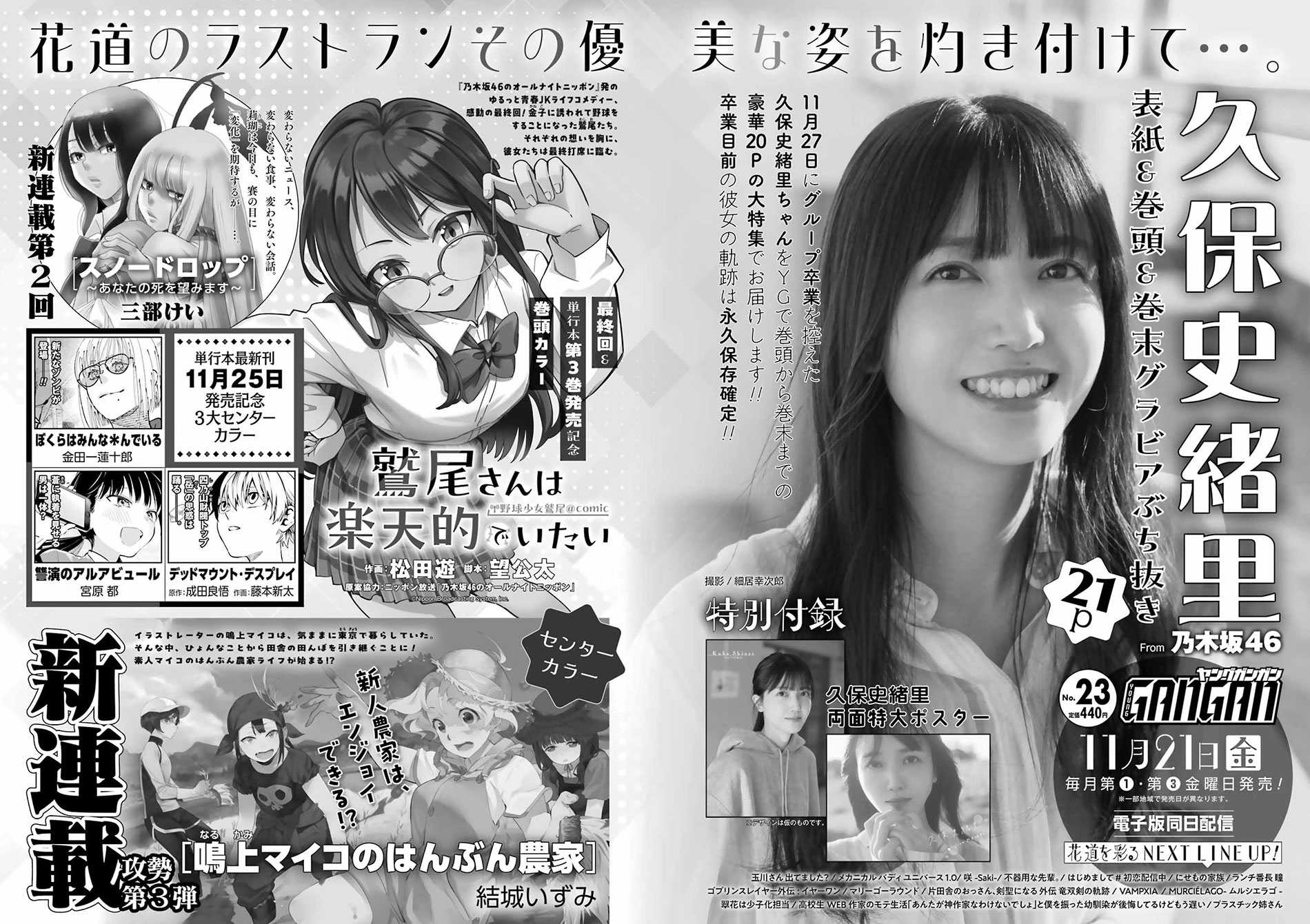 ☆乃木坂46 3期生の人気メンバーで、11月27日にグループを卒業する”久保史緒里”(24)が、11月21日に発売される『ヤングガンガンNo.23』の表紙&巻頭・巻末グラビア21Pを勝っている。
