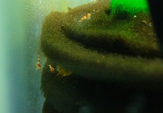 フィルターから少し雑音が出てきましたいつも掃除したら附箋に日付を書いて貼っておこうと思うのですが…今回も最後に掃除した日を思い出せません面倒だけど、掃除をする事にしました。36cm水槽のフィルターは、エーハイム2211。今年は暑さ対策の為ホースにはテトラの断熱シートを巻いて、本体には断熱クン8mmを巻いています。このままでも簡単に取り外しができましたでもフィルターを外すと、水槽のクーラーが効きません。そこそこオヤジは、大雑把に掃除するのは得意。テキパキ作業するのは苦手。急がないとバクテリアを保全する為に水道水は厳禁飼育水で洗う事とにしますが…飼育水を大量に使う事はできないので、カルキを抜きをした水で洗ってます。濾材をガラガラっと洗って、青い荒目スポンジをちゃちゃっと濯いでおしまい。今回は、細目スポンジだけ新品と交換しました。《パッケージ無し》サブストラットプロレギュラー1リットルエーハイムの外部フィルターだけでなく、外掛けフィルターなどの濾過強化にこれを利用していました。長く使っていると茶色い水垢みたいのがついて水流が弱くなるみたいですが、特に寿命があるようには思えません。気になったら水で3回ぐらい濯いでます。新規にフィルターを立ち上げる時には、古いものから1/3ほど拝借しています。前にこの濾材の隙間でびーが暮らしているのを発見した事があります。2010/3/28のブログ オペラ座の怪人(参)《パッケージ無し》エーハイムメック500ml(物理生物ろ材)これは、他の濾材と違ってフィルターの入り口に一番近い所に入れる事で効果があるらしく荒目のフィルターより前に入れる必要があります。これも、寿命があるものではないと思います。ちゃちゃっと洗い流せばまた使えます。2211でしか使った事がありませんが、他のフィルターでも使ってみたいと思っています。土日が満月だったので、期待していた抱卵の舞。まだ、抱卵びーは見つけていませんが、何回かダンスを目撃しました動画じゃないと、その激しさは伝えられません。沢山のびーが水槽内を走り回ります新たな抱卵びーは、期待する事として…気が付かなかったけど、実は抱卵びーがいたらしく、新しい稚エビを土曜日の夜に数匹発見しましたどうやら心配無用でした