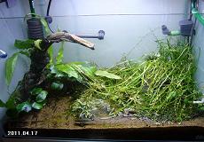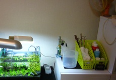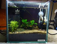 女房のボトルアクアです。流木と水草が少々。エアレーションなし。ヒーターもクーラーもなし。水温計もなし。照明もなし下手すれば2週間も水も替えてくれない劣悪環境ミナミヌマエビとヤマトヌマエビが暮らしていますすごい生命力です!今日、女房が久々にメンテしていました。いつもより綺麗です。びー水槽は、流木の中央上にアヌビアスの葉っぱが無いのが気になったので移植しました。このアヌビアスは、女房にお願いして、ボトルアクアから逆輸入。女房が自慢気に提供してくれました屈辱感でいっぱいです。グッ…残留農薬処理済!■アヌビアス ナナ(1ポット分)アヌビアスは、照明もCO2もいらないし、丈夫で簡単な水草です種類も豊富。流木付のものから色々です。適当に切って糸で縛れば石でも流木でも簡単に活着します。注意点は、生長する方向がある事。逆につけると後で後悔します。また農薬が残っている場合があるので注意が必要です。流木裏のグリーンロタラは、森を形成してくれました。肥料の追加もそうですが…ビーが心配で封印していたCO2の添加も水草の勢いに合わせて再開した事も効いていると思います。自動添加は怖いのでしていません。手で量を調整しながら、1時間ほど添加しています。今の所、ビーには影響はでていません自動添加用の電磁弁をつけたままだけど、レギュレータのネジでON・OFFをして添加しています。添加すると水草の育ちが、全然違います。ビー水槽でも、水草に気泡が出ています。CO2ボンベ1本は、タバコより安いし、今のペースなら2ヶ月以上は持つしお勧めです。限定色!清潔感溢れるホワイト!LC レギュレーターインテリジェントホワイト(RCG0307W)CO2は、初期投資が必要なので、なかなか踏み切れませんでした。一度使うと水草の生長が違ったんで、今は満足しています最低限、レギュレータと耐圧チューブ、逆流防止弁、シリンコンチューブ、拡散器が必要です。他はそんなにしないけど、レギュレータがそれなりの値段です自動添加をするには別途、電磁弁とタイマーが必要ですが、後回しでいいと思います。添加量の調整は、レギュレータの調整ネジで可能です。最後は、そこそこオヤジにはトピックスなんですが、先日、アクアギャラリー銀座というお店が、市内に引っ越してくるとのニュースをキャッチしました近くにいったら覗いてみたいと思っていた綺麗なレイアウト水槽がありそうなお店です正確な場所は、まだわかりませんが、仙川で8月6日オープンとの事。今度の土曜日に行ってみようと思っていますAQUA GALLERY GINZA引っ越してきても、GINZAなのかなぁ