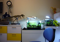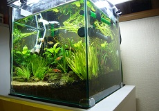 久々に水槽脇のカーテンを開けたら…が低くなってきたので部屋の中まで陽が入ってきました。勢いのでないキューバパールグラスをしばし日光浴。やっぱり自然光は綺麗です。高価なメタハラランプだとこの風合いを出せるらしいですがとても手が出ません。蛍光灯は、を全体的に供給する事ができますが拡散するので陰影は出にくいです。メタハラは、蛍光灯では出せない強力なを直線的に供給します。ハイエンドのライトは、メタハラ+蛍光灯のペアでそれはもう夢のまた夢苔が怖いので、小一時間で日光浴は終了。水槽用の蛍光灯は、家庭用とは違って水草によい光成分なっています。一番重要な明るさも忘れてはいけません。この1年で水槽界にもLEDランプが次々と発売されています。やっぱり暗いので、水草を考える場合には、まだまだ使えるとは思えません。【限定特価】スリムなボディ!コンパクトアルミライトアクシーキュート 600WW PL36W今、30cmキューブで使っているのは、コレ崩壊した60cm水槽の備品なので、30cm水槽では横にはみ出ています2本使っているので、都合72W。ただ、明るさは水深が関係すると思っているので30cmキューブは、幅はともかく奥行、高さは60cm水槽と同じさほどオーバスペックだとは思っていません。ケルビンは、8000Kコンパクトボディ!《本体ホワイト》ファンネル2 150W 10000Kちなみに、メタハラはこんなのが欲しいなぁ現実的には無理。本体の値段も高いし、交換球もかなり高い夢を見るなら思い切ってADAのメタハラもありかもサンゴを育てる場合には、メタハラは必需品らしいです。淡水に比べ他にもランプ以外にも色々お金がかかります。海水水槽を維持している人とは仲良くしといたほうがいいと思いますちなみに、これは、びー水槽と女房のなんちゃって水槽。綺麗でしょ。蛍光灯でもインテリア性は高いです。でも、自然の光みたいな陰影や水面の揺らぎは、感じられませんメタハラなら、水草の生長も水の揺らぎも加わってさらに癒されるんでしょう。年末ジャンボにお願いする事にします