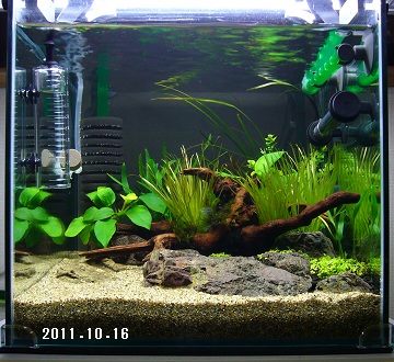 バクテリアが定着しアンモニアはすっかり消えました。60cm水槽で使っていた流木ですが水カビがでちゃいました流木を入れた初期にはよくあることです。アララ特に害は無い見たいですが見栄えが悪いです洗い流せばすぐ取れます。流木を水槽から出してさっそく作業開始です。うぎゃ~・・・先週植えたブリクサが流木に引っかってジタバタそして流木を水槽内に落として大変な事に結局あちこちの水草が抜けてプカプカ浮いてきてしまいました。ぐっ水カビは落せたけど、ブリクサは早くも一回り小さくなりましたもう魚は入れられる環境ですが…キューバパールが根付いているように思えません。底ものの魚を入れると剥がれそうです。調べると1ヶ月ぐらいすると突然スイッチが入るらしい。このまま終わる事とも多々。どうなる事やらもうひとつ問題が…アンモニアが分解されるとそこそこ水槽は毎回苔の洗礼を受けます挨拶にくるのは、フサフサした緑の苔とトロロコンブみたいな苔乗り切ると安定するので、分解されてできる硝酸塩を水草がお腹一杯で残しちゃうんだと思います。魚もしばらく入れず様子見水草は、簡易CO2グッズで生長をバックアップ後は先回りでガンガン換水を行い最初の洗礼を最小限に食い止めたいと思います。美しい水草水槽の必須アイテム!水草育成用 CO2二酸化炭素添加セット高価なCO2システム使わず今回はこのCO2スプレー缶と拡散筒のこのグッズを使用。筒の中にCO2をいれておくと、徐々に水に溶けていきます。疑ってたけど、意外と使えるかも知れません。スプレーがになったら、ビー水槽のCO2システムのボンベからガスを分けようと思ってます。CO2ガスを自作する事もできるらしいです。無農薬!■クリプトコリネルーケンス(1ポット分)クリプトコリネ系の水草は初めて買いました。ルーケンスは小ぶりなので前から興味を持っていました。お手頃価格ポットだとバラすとかなり量があります30cmキューブでは、1株だけ右手前に植えてあとは後景としして植えました。高温さえ気をつければ良い簡単な水草みたいです。