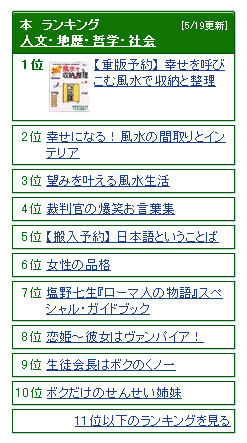 ここ最近、このブログに表示している楽天ブックスのランキングが何か変。人文・地歴・哲学・社会 ランキングのはずなのですが、8~10位がフランス書院の美少女文庫、なんですよね。第8位恋姫~彼女はヴァンパイア!青橋由高フランス書院648円 (税込:680円) 第9位生徒会長はボクのくノ一上原りょうフランス書院648円 (税込:680円) 第10位ボクだけのせんせい姉妹羽沢向一フランス書院648円 (税込:680円) この見事なラインナップ。気になってしかたありません~