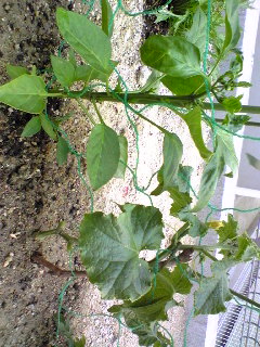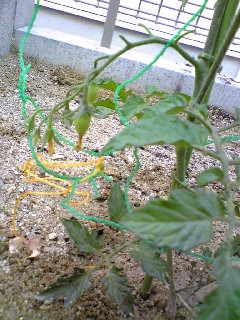 上→ピーマン 下→きゅうり(見にくいです。すみません)ピーマンはちっちゃい蕾が二つくらい見れました。咲くか・・・・!?不安ですけど。あかちゃんきゅうりは、花が咲き始めましたかわいぃ~でも初めてなので、こんなものなのか?不安ですが。こちらのきゅうりに関しては昨日、実は悲しいことに、うどん粉病かな?と気づきまして若干ショックを・・・一番下の葉っぱが白い粉をふいてまして、「これがうどん粉病かな?」と思いました。とりあえず、うちにある家庭用の希釈なしで良いスプレータイプの薬を振り掛けました。ミニトマト苗と苗の間隔も近すぎたかな?なんか、いっぱい失敗してる気がします。ミニトマトの左がきゅうり。なんか、まだまだきゅうりは小さいです。全ての野菜達に、アブラムシが徐々に。。。葉っぱが黒い斑点みたいになってるし病気?食害?なんかこのまま枯れないか・・・・フルーツトマトこちらはミニトマトより先に実がつきまして。。今はこんな感じです。サイズ分かりますか?さらに、初めてなのに、色んな物植えてしまいました。唐辛子らしいですが。苗、間違ってないかな・・・似てるのが近くにあったからちょっと心配。ゴーヤの苗(30円)この安さに惹かれて、買ってしまったもう、この際アブラムシやら、なにやらにやられたって仕方ない・・・失敗覚悟で、思い切って、植えてみました。きちんと調べたり、ちゃんと管理してある方とは違ってお恥ずかしいですが。。。記録として残しておきたいと思います