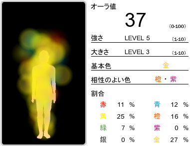 サイトで名前を入力したら自分のオーラが見れるという・・・やってみました。おぉ。いいのか・・悪いのか?当たってるの・・・??分かりませんが。ちなみに、昨日~今日会社の旅行でして。。実際にオーラ診断っていうやつ。(写真撮ってオーラと一緒に印刷してくれるやつ。)やってみました。真ん中が黄色。右と上が青。左が濃い青。ってことで、なんか解説してもらって終わり。まぁ、旅行だから記念にやってもらったけどはじめてだったので、なるほどなぁ~という感じでした。で、サイトでも似たような色と思ったら「金」????「 金のオーラ・・・ 最も崇高な色、英知・発想力がある、失敗を恐れない 」らしいですが。ちなみに、失敗は恐れまくってますけどやったことない人。良かったらどうですか?こちらリンクオラオーラ