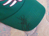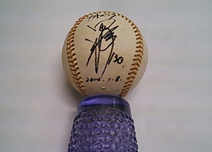 力強い、決意の輝く眼で、!。微笑みながら、 私の、東北楽天イーグルスのグリーンユニフォームにサインをする勧野選手。 さー思う存分、戦え、 全ての人に、 恩返しをするために!。