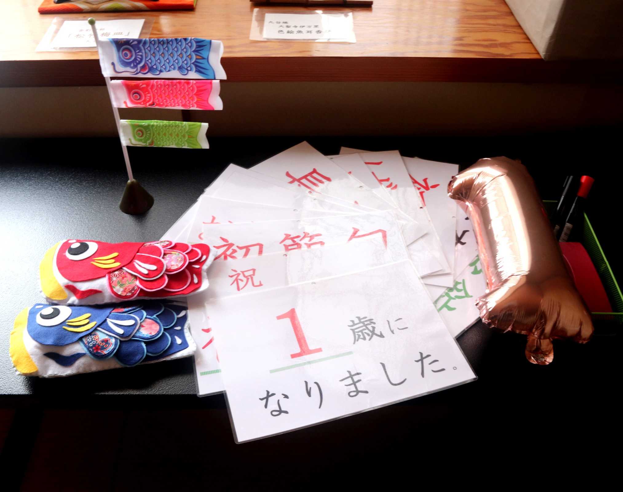 自作の 一歳おめでとうシール 初節句おめでとうシールを貼ってございます。