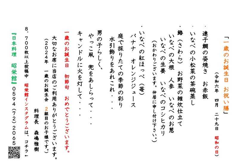 一歳のお誕生日お祝い膳(3,800円 税込)のお献立です。