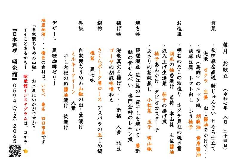 お電話  0594-72-2065 日本料理 昭栄館