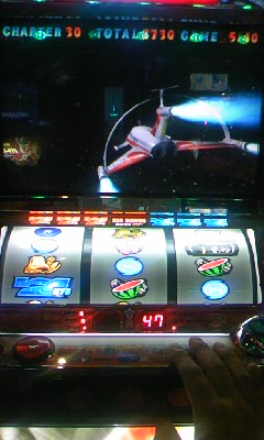 『前日の不発台を狙え!!』メール会員への指令所です。そんなことは気にしない流星です。もちろん狙うは据え置き狙いで前日6狙い。そんなことはあるわけない。5K投資・・・ た、隊長がピグモンに!!これが、ゼットンボーナス・・・UM入らず。のまれる前に青7ゲット。高確じゃないのに関わらず、意外と2択が多い。(まさかほんとに?据え置き?)UM2回。のまれて追加5Kで赤7ゲット。逆押し成功でUM8回。ビック連せず・・・その後、赤7、赤7と続き、ビック4、ゼットン5・・・(もう無理・・・絶対設定変更しとるがな・・・)その台を後に。800枚程もって[楽し~さ~]で40回転でビックゲット。32Gで引き戻さず120G回してやめ。ちょっと増えた。ビーキッズクラブで30回転でバケゲット。昔ほどの魅力を感じず50回転回してやめ。ウルトラマンに戻り朝一出てた台で。70回転位回した処で青7。なんか知らんがウルトラマークMAXなのにUM2回。上げ設定になってるのは確かなんだが・・・ゼットン倒してもUM2回。赤7で逆押しでUMゲットも2回。コンスタントにボーナス引くもUM続かず・・・赤7の比率が多いので設定5を予想してたが・・・ベルが極端に少ない・・・(まさか設定3なのか?)増加のスピードがまったりなので挫折してやめ。 その後、緑ドンを打つがパッとせず徘徊・・・!!!!990回転のマッハGOGO!発見!!2Kでビック。ビック中に青7揃いでGOGOTIMEゲット。途中でビック揃い、またビック中に青7揃い。GOGOTIME6回で800枚ゲット。その後600G付近でビックゲット。その後、無性にゲッターロボ打ちたくなって80G回して移動。全のまれで2K追加でビック。ゲッターチャンスでビック3連させて1100枚程に。ほとほと疲れまくってたんで少し飲まれてやめ。前日の6000枚の稼働の疲れが・・・・ 総投資 18000円 回収 42500円 収支 +24500円いかんな・・・でわでわ・・・・?