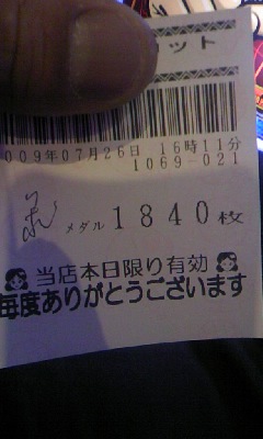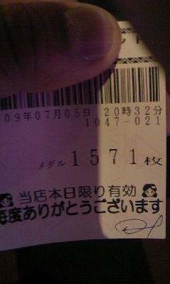 こんちは、7月20日は海の日!!ここ数年、海には縁のない流星です。祭日だけど仕事の入っていた流星は、前日の悪夢に負けずに仕事。でもね、早く終わっちゃーしょうがないでしょ?出動しましたよ。夕方からね。夕方からホーム店行くのはちょっと遠いんで、以前のホーム店へ。投資6K。 のっけから一撃!!UM後、300程回してやめ。会社の後輩がクラシックジャグラー打ってたんで、クラシック初体験。2Kでぺカ。ビック3、バケ3、ぺカぺカ。しかし、のまれる。入ったばかりのニューパル3。1Kでビック。んで、コンスタントにボーナス引いて・・・ビック4、バケ3。1500枚程に・・・総投資 16000円 回収 74000円 収支 +58000円前日の負債が一気に・・・変な連日だった・・・でわでわ・・・・?