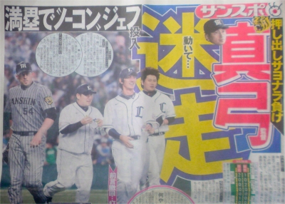 昼休みにサンスポをチェック。阪神ファンなら球児出すか、アッチソンの続投だと思ってたんで、「迷走」って書かれても仕方がないかな~小さく「G.G.佐藤がサヨナラをお膳立て」って記事がありましたけど、確かに西武の9回は、ヒットはG.G.の1本だけなんですよね。そういう意味では、G.G.をもっと評価して良いんじゃないかなぁ・・阪神ファンから、「ワズディンってどうなん?」って尋ねられましたが、『巨人にいた時よりええよ~ オープン戦でも阪神はダメだったよ』と脅しておきました(^_^;)今夜も、KBS京都で試合開始から終了まで中継が有ります。今日の解説は松沼雅之さんですよ~。懐かしいですね。関西にいると、滅多にテレビでもお目にかかれないし・・・ということで、今日も定時であがります(^_^.)