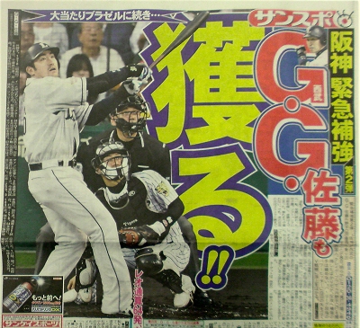 今朝テレビを見ていたら、スポーツ新聞の紙面が映ってました。「G.G.佐藤」の文字が大きく・・・獲る!!ってどうやら阪神が獲得か?という観測記事みたいでした。会社へ行く途中のキオスクで、そのサンスポを買いました。昨日は阪神がソフトバンクに大敗したので、1面がこんなことに!右翼手が欲しい阪神と、左投手が欲しい西武の思惑がまとまれば、有り得るのかなぁ?ブラゼル獲得を最初に記事にしたのもサンスポらしいので、周囲の阪神ファンは、もうその気になってるんですけど・・・・(ーー;)関東のサンスポだと1面は違うんだろうけど・・■虎の緊急補強第2弾!G.G.佐藤獲る! (1/3ページ) - 野球 - SANSPO.COM まあ西武ファンとしては、かなり複雑な心境ですよ。うちの西武戦の次回観戦予定は、今のところ8月1日の大阪ドームなんですけど、その時には、もうG.G.佐藤がいないかも・・・まあシーズン中のトレードは無いだろう・・・無しにして(ーー;)