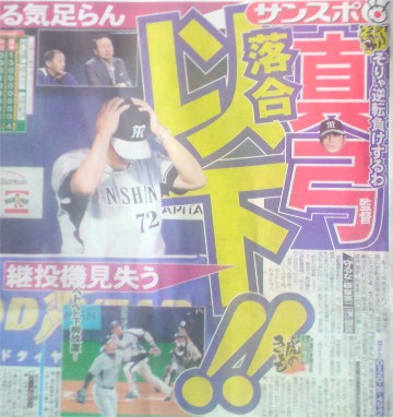 昼休みにスポーツ紙を見たら・・・・「落合以下!!」って・・・なんぼ関西限定?の1面でも、これは無いわな~私も落合監督は好きではないというか嫌いですけど、監督1年目の真弓が、いつ落合監督より上だったことが有るのかと問い詰めたい・・・(^.^)でも、あのダンカン氏も「断崖絶壁」と言い出したくらい阪神はひどい状態ですね。□【ダンカン】恐ろし阪神病…胃カメラ飲みます - 野球 - SANSPO.COMまあ、阪神タイガースのことは置いといて・・・西武も中継ぎ抑えがどうにもならん状態ですね。打撃の方はそれなりに頑張ってるのに・・・□西武、また中継ぎ陣乱れて3連敗 - 野球ニュース : nikkansports.comおまけに帆足投手も戦線離脱?□西武・帆足、違和感訴え途中降板 - 野球 - SANSPO.COM「1日に福岡市内の病院で精密検査を受ける。」ってことは、チームと離れて地元に帰るようだし・・・(ーー;)今日は岸投手ですが、今シーズンは対ロッテは初ですね。ロッテとは打ち合いになる試合が多いですが、なんとか頑張って勝ってもらいたいなぁ・・今日負けたら、オールスター迄に借金返せないような気がする(ーー;)