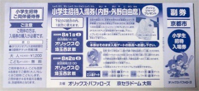8/1,2のオリックス・西武戦の、小学生招待入場券(内野・外野自由席)でした。