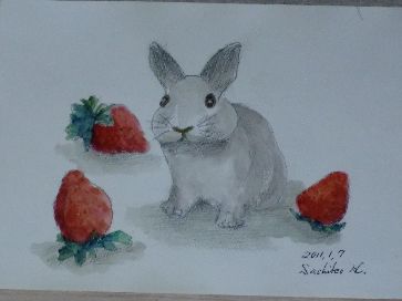 お絵描きにとジャンボいちごをいただきました キウイぐらい大きくおいしそうなので 描きながらパクリと食べたくなりました 一時間もっと食べたい誘惑を払いのけながら無事描き終えました 実物よりかなり小さくなりました ウサギちゃんも食べたいのを我慢しているようです おりこうなうさぎです 人気ブログランキングへクリックお願いします ご訪問ありがとうございます。