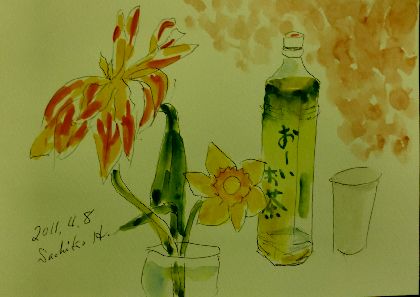 おばけチューリップが元気が無くなりました プランターではピンクの可愛いチューリップがひらきはじめました なんだか取り合わせの不自然な球根セットでした 「おーいお茶」はおとといの老人お花見会でいただいてきました 明かりのしたでボトルの色が美しく見えたので描きました人気ブログランキングへクリックお願いします ご訪問ありがとうございます。