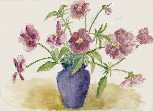 パンジーさんありがとう まだ寒い2月中ごろ植えました 雪の降る朝でも健気に新鮮な花をみせてくれました あれから3カ月の間プランターにあふれるほど咲きました 気温も20度を超すこのごろようやく疲れがみえてきました 四方八方に伸びて株の姿がみだれてきています まだまだきれいな花を咲かせていますがもうお休みにしましょう 長い間ご苦労さんでした 最後の花を食卓にいけて描きました 人気ブログランキングへクリックお願いします ご訪問ありがとうございます。