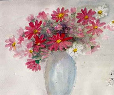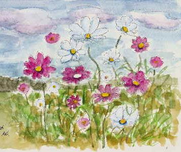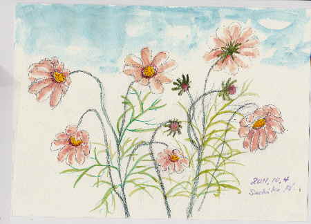 まッちゃんの作ったコスモスです 昨年も描きました大きい花です ところが今年は出来が悪くて 3,4本ほどしか咲かなかったそうです わたしはスーパーで種を買って来て蒔きました 一度目は台風でだめになりました 二度目に生えたのは2本で 見慣れない草が一面に生えてきました 2本のコスモスはいつまでたっても ひょろひょろのくにゃくにゃです 人気ブログランキングへクリックお願いします ご訪問ありがとうございます。