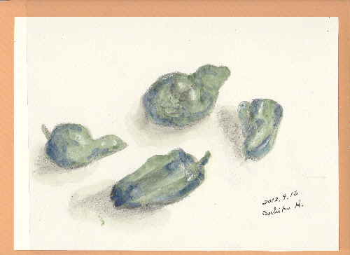 ピーマンを描く 濃い緑のつやつやと光っている 頬ずりしたくなる すべすべの肌 三つ目を描いている 色はおなじだが 形がちがう 良く似ているが 同じものはない 人間と同じだなあ 似ているがどこかちがう 人間と違うところは 味はみんな同じようだ 人間の味は十人十色 だから面白いんだね人気ブログランキングへクリックお願いします「さっちゃんのお気楽ブログ」のポストカードをご希望の方は 下記「手づくりの店 本郷」さんにお問い合わせください。 ---------------------------------------------------手づくりの店 本郷 〒776-0010徳島県吉野川市鴨島町鴨島233-1Blog : http://ameblo.jp/hongo-blog/TEL : 0883-24-3711E-mail : secchan@brown.plala.or.jp----------------------------------------------------ご訪問ありがとうございます。
