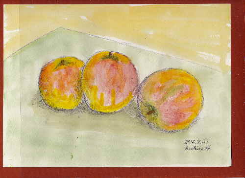 どんより曇った重たい午後 いろどりのないモノクロの世界 お絵かきする気になれない コスモスも日日草も沈んでいる そうだ! きのう買ってきたりんご 赤と黄色のかわいいりんご あのかわいこちゃんを 3個仲良く描いてあげましょう人気ブログランキングへクリックお願いします「さっちゃんのお気楽ブログ」のポストカードをご希望の方は 下記「手づくりの店 本郷」さんにお問い合わせください。 ---------------------------------------------------手づくりの店 本郷 〒776-0010徳島県吉野川市鴨島町鴨島233-1Blog : http://ameblo.jp/hongo-blog/TEL : 0883-24-3711E-mail : secchan@brown.plala.or.jp----------------------------------------------------ご訪問ありがとうございます。
