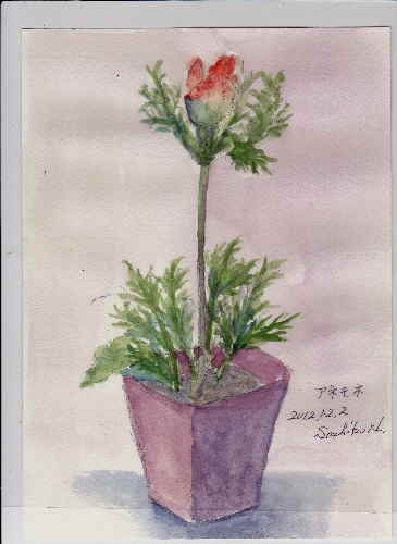 先日のアネモネが開きました 今朝ぱっちり開いていたのに 買い物から帰るとぐったり首をたれていました たいへん! 今日のモデルさん しっかりしてよ 水をたっぷりあげました 元気になってよおー 3時間ぐらいして茎がまっすぐ立ってきました でも花弁がきれいに開ききらないので ストーブで1時間ほど温めました ようやく全開になりました 描き始めると眠くなってきました うつらうつらしながらそれでも描き上げました人気ブログランキングへクリックお願いします「さっちゃんのお気楽ブログ」のポストカードをご希望の方は 下記「手づくりの店 本郷」さんにお問い合わせください。 ---------------------------------------------------手づくりの店 本郷 〒776-0010徳島県吉野川市鴨島町鴨島233-1Blog : http://ameblo.jp/hongo-blog/TEL : 0883-24-3711E-mail : secchan@brown.plala.or.jp----------------------------------------------------ご訪問ありがとうございます。 「また、あした。」はサイン入りで手づくりの店本郷へお願いします。 アマゾンでは送料無料です