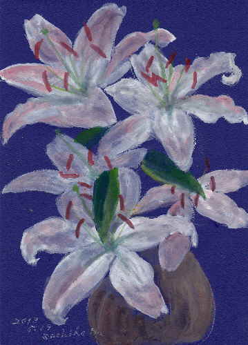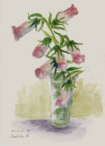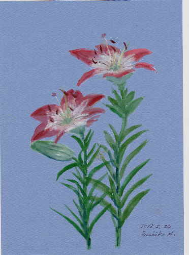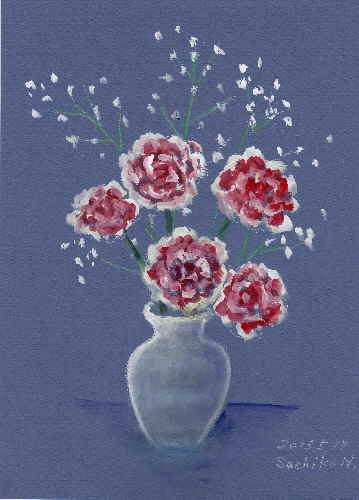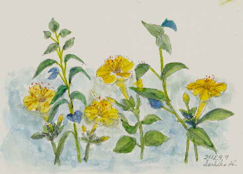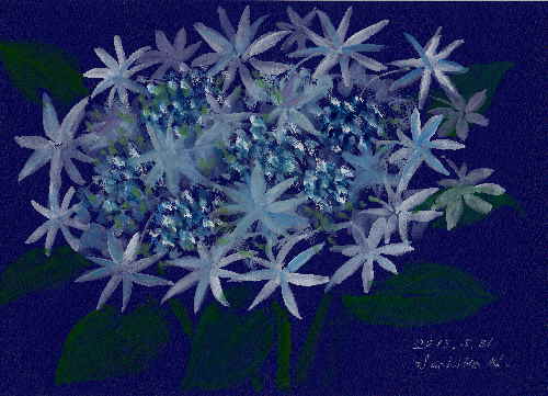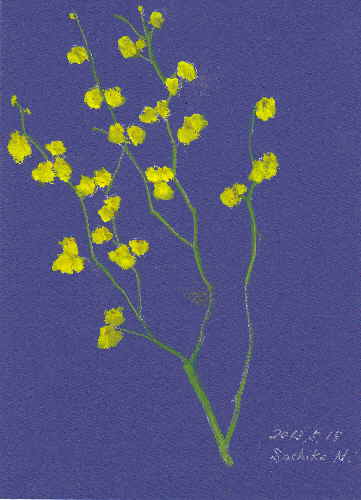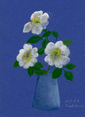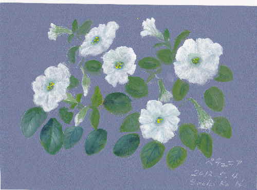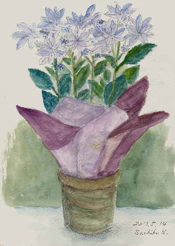 銀座の花火 一度聴いたら忘れられない豪華な感じがしますが お花は清楚な美人といった風情です 以前白の大きい枝を描きましたが この薄いみずいろのやさしい ヒラヒラする花ビラの美しさ 会場に来られた方みなさんが目を止めて 見とれるほどの美しさでした くださったのは音楽教室の先生です やっぱり心優しいこのお花のような でも明るくて若さあふれる方です 原画展もあと一日でおわります 新聞を見たといって遠くからもたくさんのかたが みにきてくださいました 本当にありがたいと感謝いたします人気ブログランキングへクリックお願いします「さっちゃんのお気楽ブログ」のポストカードをご希望の方は 下記「手づくりの店 本郷」さんにお問い合わせください。 ---------------------------------------------------手づくりの店 本郷 〒776-0010徳島県吉野川市鴨島町鴨島233-1Blog : http://ameblo.jp/hongo-blog/TEL : 0883-24-3711E-mail : secchan@brown.plala.or.jp----------------------------------------------------ご訪問ありがとうございます。 「また、あした。」にサインをいたします 手づくりの店本郷までよろしくお願いいたします