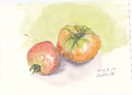 この頃のトマトは熟れすぎ見たいに赤一色で新鮮にみえない 以前のトマトの新鮮なものは青いところが残っていた ももたろうとかなんとかいってよっぱらいみたいな この頃のトマトを若い人が好むとは思えない まっちゃんが作ったこの絵のようなトマトうれしいなあ こんなトマトを作ろうと今年も4月から意気込んで 鶏糞も入れて植えたのに雨がまったく降らない 8月になっても降らない おてんとさんがいじわるしているんだろ 農家の人はどうしたらいいんだ 人間の力ではどうにもならないことがいっぱいある 努力はするけれど「また、あした」があるんだと あきらめるしかない 自然ていうものにはかなわないんだ人気ブログランキングへクリックお願いします「さっちゃんのお気楽ブログ」のポストカードをご希望の方は 下記「手づくりの店 本郷」さんにお問い合わせください。 ---------------------------------------------------手づくりの店 本郷 〒776-0010徳島県吉野川市鴨島町鴨島233-1Blog : http://ameblo.jp/hongo-blog/TEL : 0883-24-3711E-mail : secchan@brown.plala.or.jp----------------------------------------------------ご訪問ありがとうございます。 「また、あした。」にサインをしています 手づくりの店本郷までお願いいたします