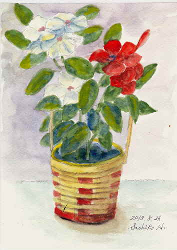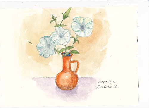 今まで会ったことのない熱気 窓の外で胡瓜が固まってしまって静止画像になっている 「おーい 生きているかい?」 生まれたばかりの胡瓜の赤ん坊はかわいそうに 黄色い花をしっぽにぶらさげて干乾びていく 窓の外の風景が無風というのは気味悪い 緑の葉がかぜにゆれていると 「ああ、生きているんだ」と思うが 無風は死の世界、ゴーストタウンが目に浮かぶ おお、 インゲン豆の蔓のさきが かすかに揺れ始めた 呼吸しているみたいだ 「がんばれよー」人気ブログランキングへクリックお願いします「さっちゃんのお気楽ブログ」のポストカードをご希望の方は 下記「手づくりの店 本郷」さんにお問い合わせください。 ---------------------------------------------------手づくりの店 本郷 〒776-0010徳島県吉野川市鴨島町鴨島233-1Blog : http://ameblo.jp/hongo-blog/TEL : 0883-24-3711E-mail : secchan@brown.plala.or.jp----------------------------------------------------ご訪問ありがとうございます。 「また、あした。」にサインを入れています 手づくりの店本郷までお願いいたします