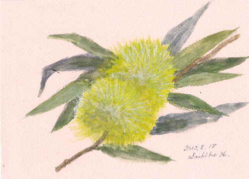 栗のいがの役目 ? 栗の果実が大きく育つまでいがの殻の中で 保護されていて、いたいから虫も近づけないはずだ 果実が充実してくると、ぱっくり口を開けて 果実は独り落ちる 厳重に保護されているはずだのに いつ、どこで、虫が卵を産みつけておいたのだろう? 食べようとすると、中から幼虫がピコピコあらわれて 、お先に失礼とばかりに、すでに糞だらけだ 手間かけてきれいに渋皮までむいたのに けしからん! いつ、どこで、もぐりこんだのか 徹底的に究明しにゃけりゃ許せない ひょっとして、いがができるまえにもぐりこんで 卵をうみつけておいて しらぬかおしているにちがいないのだろう人気ブログランキングへクリックお願いします「さっちゃんのお気楽ブログ」のポストカードをご希望の方は 下記「手づくりの店 本郷」さんにお問い合わせください。 ---------------------------------------------------手づくりの店 本郷 〒776-0010徳島県吉野川市鴨島町鴨島233-1Blog : http://ameblo.jp/hongo-blog/TEL : 0883-24-3711E-mail : secchan@brown.plala.or.jp----------------------------------------------------ご訪問ありがとうございます。 「また、あした。」にサインをいれています 手づくりの店本郷までお願いいたします