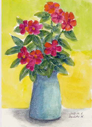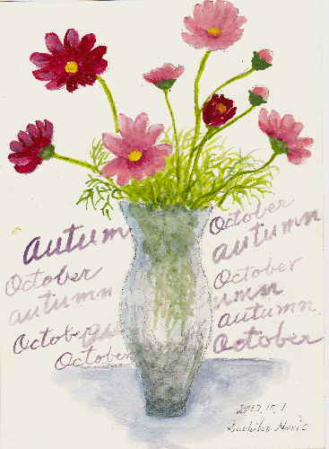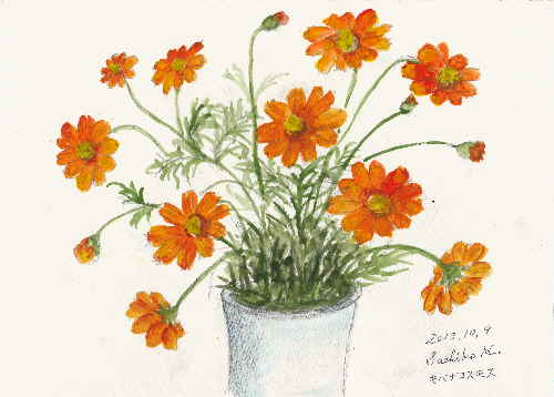 花瓶の中の オレンジ色のコスモス かなり元気がなくなっています 久しぶりの静かな一日 「さあーみんな元気に踊ろう」 黄花コスモスが陽気に踊りだしました さっちゃんがいつものようにお絵かきをはじめました どこからか運動会の行進曲が流れてきました お花たちはお遊戯を始めています さっちゃんの心の中に幼い日のときめきが よみがえってきました 黄花コスモスのお花のなかまいりして 心の中に幼い日のときめきが!人気ブログランキングへクリックお願いします「さっちゃんのお気楽ブログ」のポストカードをご希望の方は 下記「手づくりの店 本郷」さんにお問い合わせください。 ---------------------------------------------------手づくりの店 本郷 〒776-0010徳島県吉野川市鴨島町鴨島233-1Blog : http://ameblo.jp/hongo-blog/TEL : 0883-24-3711E-mail : secchan@brown.plala.or.jp----------------------------------------------------ご訪問ありがとうございます。 「また、あした。」にサインをしています 手づくりの店本郷までお願いいたします