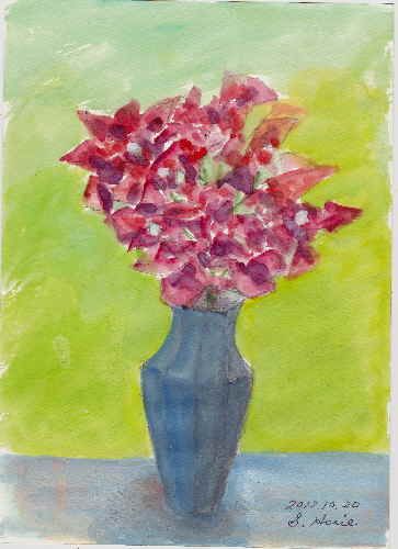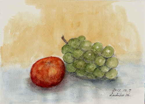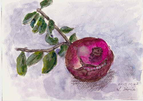 モデルの交代です きょうは火曜日まっちゃんがお花をもってきてくれます 「なにかなあ」 と期待していました ジャンボざくろとけいとうとつわぶきでした お隣につわぶきが咲き始めたので 描きたいなあと思っていたので 早速机の上に置いたらひっくり返り水だらけになりました 花が重たかったようです 「つわぶきちゃんが嫌なら、ザクロくんを描くよ」 ということで、手早く描けそうなザクロを描きました ザクロを描いていると割れ目からきれいなピンクの歯がみえて 「さっちゃん きれいに描いてよね」人間も果物もお花も思いはおなじようですね人気ブログランキングへクリックお願いします「さっちゃんのお気楽ブログ」のポストカードをご希望の方は 下記「手づくりの店 本郷」さんにお問い合わせください。 ---------------------------------------------------手づくりの店 本郷 〒776-0010徳島県吉野川市鴨島町鴨島233-1Blog : http://ameblo.jp/hongo-blog/TEL : 0883-24-3711E-mail : secchan@brown.plala.or.jp----------------------------------------------------ご訪問ありがとうございます。 「また、あした。」にサインをしています 手づくりの店本郷までよろしくお願いいたします