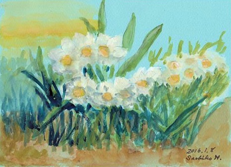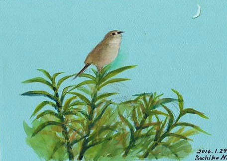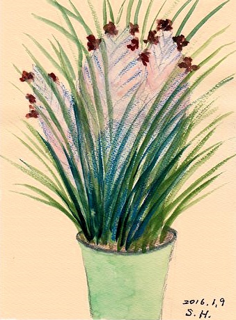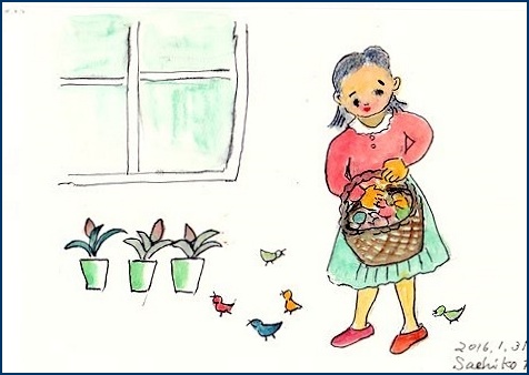 <蘭子ちゃん、どこへ行ったの?>ホームの8階の屋上に小さいお部屋がありました。建てた時何かに使う必要があって作ったものでしょうがやがて使われなくなっていました。だれにも気付かれずにその小部屋にいつからか女の子が一人住んでいました。珍しいイタリアのランを植えて熱心に育てていました。毎日優しく世話をしてあげるので葉の色つやもよく元気に育って大きい蕾が出てきました。どんな花が咲くかと楽しみにしていました。ある朝、目が覚めるとどこからか爽やかな音楽が聞こえてきました。欄子さんは大きく深呼吸をして起き上がりました。そのとき「ポン」と音がして欄の蕾が開きました。さぞ美しい花が咲く物と思っていましたが蕾の中から飛び出してきたのは小さい小鳥たちでした。それも赤黄色、ピンク草色などでピヨピヨと啼きながらちょこちょこ駆け回っています。(つづく)人気ブログランキングへクリックお願いします「さっちゃんの油彩画廊」の作品、さっちゃんサイン入りの「青蛙のペキ」「また、あした。」、「さっちゃんのお気楽ブログ」のポストカード等をご希望の方は 下記「手づくりの店 本郷」さんにお問い合わせください。 ---------------------------------------------------手づくりの店 本郷 〒776-0010徳島県吉野川市鴨島町鴨島233-1Blog : http://ameblo.jp/hongo-blog/TEL : 0883-24-3711E-mail : tedukuri-hongo@mb.pikara.ne.jp----------------------------------------------------ご訪問ありがとうございます。