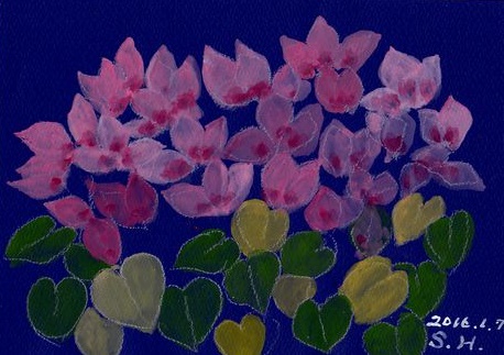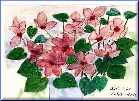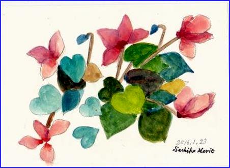 お正月は晴天続きで今年1年の平和を象徴しているようでおめでたいムードでありました。今日5日になって、朝から重い雲が空にたちこめて神山は雲の中に沈んでいます。オーイ、神山のみなさん、まっチャン、香代ちゃん、新田さんやお絵かきのみなさん、お元気ですか。ここ虹の橋にきてから4階のベランダから毎朝まづ神山のお天気を見ています。(ベリー君の冒険 5> シクラメン「さあ、こんどはべりー君が鬼さんだよ。 眼を閉じて十数えてね」シクラメンさんはきれいなお花が少しちぎれて身軽になったので、ピョンピョンベッドの上を飛び越えて窓のカーテンの陰に隠れました。曇っているので影は映りません。見つからないと思っていた所がその時太陽が雲の陰からでてきました。シクラメンさんの姿はぱっちりカーテンに陰を映していました。ベリー君「アハハのハッハ、シクラメンさんはっきりみえてるよ」またまた、見つかってしまいました。さーて、こんどはどこにかくれましょう?人気ブログランキングへクリックお願いします「さっちゃんの油彩画廊」の作品、さっちゃんサイン入りの「青蛙のペキ」「また、あした。」、「さっちゃんのお気楽ブログ」のポストカード等をご希望の方は 下記「手づくりの店 本郷」さんにお問い合わせください。 ---------------------------------------------------手づくりの店 本郷 〒776-0010徳島県吉野川市鴨島町鴨島233-1Blog : http://ameblo.jp/hongo-blog/TEL : 0883-24-3711E-mail : tedukuri-hongo@mb.pikara.ne.jp----------------------------------------------------ご訪問ありがとうございます。