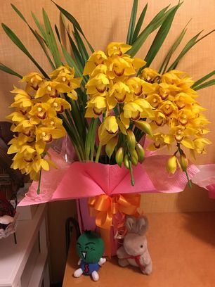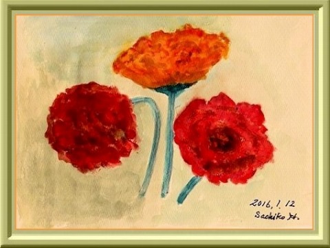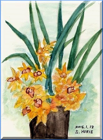 元日に届いたお年玉有難うございました。シンビジュウムの3本仕立てびっしりオレンジ色の大きいお花が新しい年を祝福しています。今年もきっと良いことがあるでしょう。皆さんから嬉しい年賀状をたくさんいただき有難うございました。今年もみんなでがんばって平和な社会を願って力を合わせましょう。* * * * * * * * * + * * * * * * * * <ブルーベリーの冒険 > ブルーベリーの丸薬がこっそり一個転がり出ました椅子の肢の陰に隠れてゆくえ不明探したが見つかりませんベリー君カーペットの柄にまぎれて知らん顔ベリー「そうだ、ちょいと遊んで行こう」黒い粒はコロコロ転がって部屋の中をひとめぐりベリー「これなんだ?絵の具のチューブ見付けたよ」クリ―ム見たい おいしそうひとなめ、ふたなめ顔中べたべた 気味悪いようベリー君黄色のお化けになりました人気ブログランキングへクリックお願いします「さっちゃんの油彩画廊」の作品、さっちゃんサイン入りの「青蛙のペキ」「また、あした。」、「さっちゃんのお気楽ブログ」のポストカード等をご希望の方は 下記「手づくりの店 本郷」さんにお問い合わせください。 ---------------------------------------------------手づくりの店 本郷 〒776-0010徳島県吉野川市鴨島町鴨島233-1Blog : http://ameblo.jp/hongo-blog/TEL : 0883-24-3711E-mail : tedukuri-hongo@mb.pikara.ne.jp----------------------------------------------------ご訪問ありがとうございます。