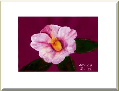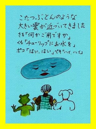 < ベリー君の冒険 2>ベリー君が絵具の黄色をクリームと思ってなめているうちに顔中が絵具でベトベトになり手も脚もくっついて動けなくなりました。べりー「誰か―助けてよ―」と叫んでいるのを聞きつけたシクラメンさん,大株のピンクの大きい花びらをフサフサさせてシクラメさん「ベリー君がクリームになめられてヨタヨタしているよ。助けてあげよう」と、べりーくんのクリームをぺろぺろなめてとってあげました。ベリー君はようやく息ができるようになって、ころりんと起き上がりました。その時,シクラメンさんはとってもびっくりしました。絵の具で泥んこだったべりー君は黒くてクリクリしたかわいい男の子でしたシクラメンさんは一目で仲良しになりたいと思いました。 人気ブログランキングへクリックお願いします「さっちゃんの油彩画廊」の作品、さっちゃんサイン入りの「青蛙のペキ」「また、あした。」、「さっちゃんのお気楽ブログ」のポストカード等をご希望の方は 下記「手づくりの店 本郷」さんにお問い合わせください。 ---------------------------------------------------手づくりの店 本郷 〒776-0010徳島県吉野川市鴨島町鴨島233-1Blog : http://ameblo.jp/hongo-blog/TEL : 0883-24-3711E-mail : tedukuri-hongo@mb.pikara.ne.jp----------------------------------------------------ご訪問ありがとうございます。
