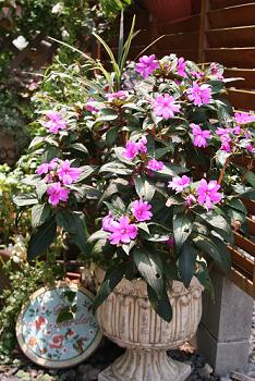 今年の夏、初めて育てた【サンパチェンス】。三色買って、一番大きく育ったのはラベンダー。↑の写真は、随分前のもの。今朝のサンパチェンスは、それは見事な大きさだった。でも・・・・午後に見たときは・・・・強風に煽られ・・・見るも無残な倒れ方で大きいだけに修復不可能・・・・。長い間楽しませてくれてありがとう。サンパチェンスさん、さようなら~~~~~~~代わりに、この前買ってきた、ハツユキカズラなどを寄せ植えに。玄関先の葉っぱワサワサコーナーに咲いた【猫のひげ】を寄せ植えに使うつもりだったけど、植え替えたら弱ってしまいそうな気がしてやめた。プレクトランサスも、今植えてある場所の方が合ってるような気がして、寄せ植えには使わず。猫のひげはピョンピョンとひげが生えてて、本当に可愛いお花寄せ植えに使ったのは↓。右上のパセリは使っていませーーーん寄せ植えは、恥ずかしくて、ここではお見せできません