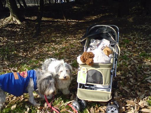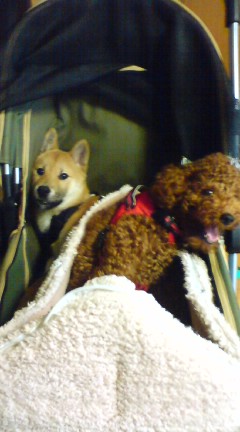 今日はお天気悪かったけど、雨がやんだ隙にちょっとだけお散歩。みんな揃ってお散歩するためには、お散歩カーにこーちゃんとどんぐり君が一緒に乗らなきゃならない。どんぐり君は吠えもしないしガウガウとも言わないしされるがままなんだけど、問題はこーちゃん以前譲渡会で会った時に、お散歩カーに一緒に乗せてみたけど、こーちゃんのガウガウがひどくてあきらめたのだ。カートの中を、フワフワの「おうち」で仕切って二部屋にしてみた部屋の中で乗せてみるとなんとかいけそう?みんなで記念撮影どんぐり君の脚がこーちゃんの方へ侵入してくると、心のせまぁ~いこー兄ちゃんはガウガウまぁねぇ、でもこーちゃんのガウガウはいつもの事だし、咬むわけじゃないし。どんぐり君は「ガウられてまで一緒に乗ってお散歩に行きたくない」って思ってるかもしれないけど、どんぐり君だけ置いて出かけることは私はしたくない。こーちゃんによく言い聞かせて、ガウらないようにさせましょうそれにしても・・・・やっぱり、犬4匹連れての散歩って、ものすご~く濃いね