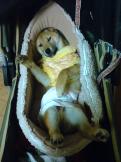 どんちゃん、明け方「クーンクーン」と啼き出し、たまりかねたチチが階下に行くと、ベッドで一緒に寝ている(小さいサークルに入ってチチと私の間に)こーちゃんが「おとーたん、どこ行くのーーー!!!!!!」ボクもーーー!!!!!」とワンワンワンワンワンワンワン仕方なく私もこーちゃんを抱いて階下へ・・・・。午前4時どんちゃん、「ケージなんて嫌ーーー!!出してーーー!」となってしまったようで・・・。そうだよねぇ、ケージに入れられる直前まで、チチとコタツに入って寝てるんだもんね雄大がいたときのように、3つベッドを並べて、真ん中のベッドにこーちゃんとどんちゃんを寝かせようかとも思うけど、ベッドでクーンクーンと啼かれるのも困るし・・・。まだ円形サークルの方が、良いのかなと、今夜は再び円形サークルにお引越し。どうか朝まで熟睡してくださいまし・・・・。どんちゃんがしっかり眠れるように、夜もしっかり散歩。カートに載せると寒そうだからって、↓スリングに入れ、上に上着を着てこれって・・・・どんちゃんが寒いからじゃなく、自分が寒いからじゃないの?