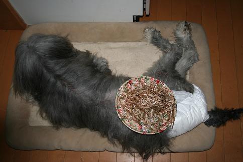 仰向けに開いておなかの上に何かをのせる【ふぁんの開き】を、ウーちゃんでもやってみようと試みたけど、ゴツゴツの身体のウーちゃんは、背中が尖っていて、仰向けに寝ることなどもうできない寝ている身体の上にお盆を載せようとしたけど、これもなかなかバランスが難しく・・・。お尻に近いあたりでなんとか成功。 ウーちゃん、14歳5か月。まだ土筆はのせられます お盆の上のものは、頭の開いたつくしもう土筆も終わりだね。「そんなモノ採りなさんな」と人に言われながらも、採らずにはいられない。それにしても、採りに採ったり、私は3月5日から、雨が降らない限り毎日毎日土筆を採り続け、はかまを取り続け、もちろん食べ続けそのせいで、指先がアクで汚くなってしまったそして、左の指が疲れてよく動かなくなったあれ?今気づいたけど、私右利きなのに、はかまを取るときは左の指で取る。みかんの皮も左手でむく。これ、右効きの人でもそうするもの? こんなに指先使った日々は無いかも ウーちゃんの登場が少ないから、ご心配くださる方も多いけれど、ウーちゃんカメラが嫌い・・・。床に這いつくばって写しても、顔がちゃんと写らず