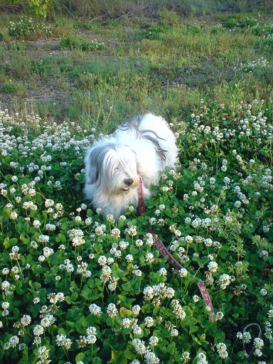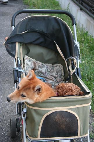道幅は狭いし、車はスピードを出して走る我が家の近所の道・・・・。ふぁんちゃんが足を轢かれて以来、怖くてだからなるべく車の通らない場所に行く。(しっかり歩く散歩は、車に乗って公園へ) 今日は、こーちゃんとどんちゃんのために、シロツメクサの生えてる空き地に 空き地のすぐ近くの道は、夕方の渋滞携帯で、それぞれの名前を呼びながら、何枚も写真を撮ってる姿、アブナイ人に見えただろうなぁカートに二匹載せて歩いてること自体、変よね
