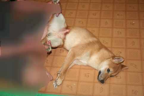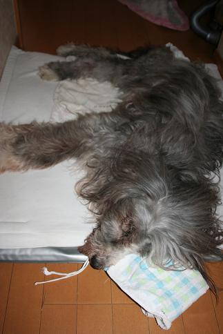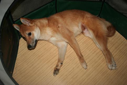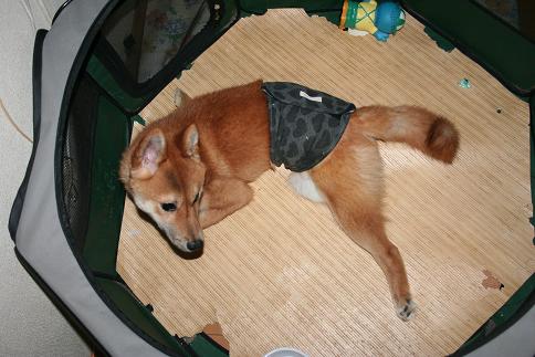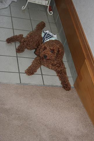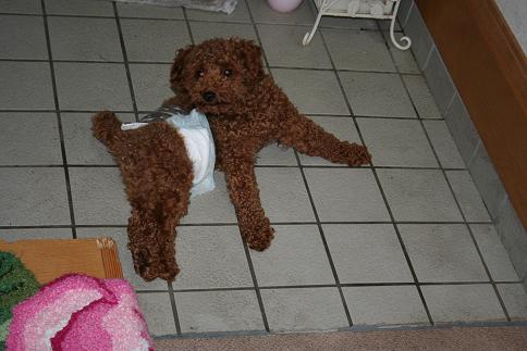 午後10時の4ワンは、何をしているかというと~ どんちゃんは、チチのリハビリを受けてる こーちゃんは、ふぁんちゃんを追いかけて玄関のスロープを滑り落ちこーちゃん、なんでノーパンかというと、ここだけの話、オチ○チ○の先の方が水膨れのようになって、中に収納できなくなったため話せば長いが、昨日ふぁんちゃんを洗ったとき、こーちゃんは「お風呂入ってるふぁんおばちゃん、最高~!」と一緒に洗い場に来て、ハッスルしてしまったのだハッスルしすぎて、普段は中に収納されている赤い部分が炎症をおこしたらしく。あ~恥ずかしいこんな恥ずかしい話、犬の話だから書ける話よね ウーちゃんは、リビングの入口のいつもの場所で寝たまま。変わったといえば、マットが夏用に変わったくらい。 一通り写真を撮って戻ったら・・・・ カゴ犬になってたぁ~