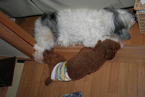 春から、毎月なぜか諭吉さんが何人も予定外に旅立たれ、普通預金はずっとマイナスそれなのに、今年の夏は、リビングのエアコンが突如ブーンと大きな音を出すようになってしまい以前の家についていた物だから、もう寿命なのかも・・・。今買うと高い!買うなら涼しくなってから。ってことで、リビングの隣の仏間のエアコンにフル稼働してもらうこととなった。でも、仏間のエアコンは、「頑張っても8畳までです・・・」という物。だから、リビングが暑いこと!!!だって、キッチンもあるんだから。料理を作る時なんて、地獄の暑さ。なのに、なのにこーちゃん「手足が冷えるから、ふぁんおばちゃんにくっつけてっと♪」私「なにぃ~?!冷えるだとぉ~~~?!」こーちゃん「そだよ。なにか?」どんちゃんは、やわらかい床のクッションフロアの上にいるはすが、やどかりのようにお家ごと移動して、いつもフローリングのところに。フローリングの方が冷たくて気持ちよいのかも。それとも、緑のマットを齧るため?朝はとんでもなく早起きになってしまったこーちゃん・・・・。どんちゃんの「ウン○出るよ~!」の大声のお知らせも相変わらず。人間はたくさん我慢することがあるけど、ワンコは天国。「なんか違うよね、これ」と思う今日この頃。
