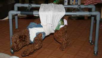 こーちゃん・どんちゃんは、事故のため歩けなくなったわけではなく(こーちゃんは人間が高い場所から落としたのかもしれないけど)、脳からきているものなので、前足とか後足が動かず麻痺しているわけではない。どこも動く。でも、思うように動かせない。どんちゃんは、後ろ足を突っ張って立とうとする動きが見られるため(頭から突っ込むから、かえって危ないんだけど・・・)もしかしたら、上半身を支える物を作ったら、少し自由に動けるようになるかも。こーちゃんは、どんちゃんよりもバランスがとれない。明らかに小脳に異常がある。でも、ふぁんちゃんのストーカーをし続けたおかげで(笑)、実に器用に這って動きまわれ、生活に何の不便もない。我が家は、重度のしょうがいを持った雄大がいたため、普通の人のように「歩かなきゃ可哀相」とは思わない。歩けない犬でも「それもアリ」なんだけど、チチ、暇だったのか、歩行器を試作。パイプを切って組んだだけの簡単なもの。身体を支える部分は、雑巾うちの雑巾は、タオルを四つ折りにせず、輪にするだけ。その方が乾きやすいから~。で、歩行器の試作品はこちら こーちゃん、雑巾に捕まり、困った顔で固まる さて、抱かれることもあまり好きじゃないどんちゃんは・・・ やっぱりね で、「オカーサン、花台に使って」って・・・・・。どこにどうやって花を置くのかね・・・?いらん 今日のチチは早朝から運がついたらしい チチのベッドの横の下に寝ているどんちゃん。今朝は午前4時頃鳴き始めたため、「おいどん(どんちゃん)まだ早いよ~」と、ベッドから下に手を伸ばして、肉球を握っていたらしい。しばらく経って手を放したら・・・・・・肉球も一緒に手に付いてきたらしく・・・・・。 肉球と思って握り続けていたモノは、どんちゃんのウン〇だったというわけ うひゃ~~~~~~~宝くじ買えば良かったのにね~。でも「運がついた」っていうより「ウンをこねた」だからだめだよね
