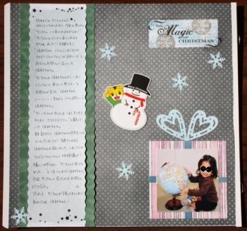 新年明けに何を今更・・・と言われそうなタイトルですが、私のアルバムページです。一昨年(2歳2ヶ月)のクリスマスはまだ何も分かっていなかったので、プレゼントなどあげなかったのですが、さすがに昨年(3歳2ヶ月)はそんな訳にもいきません。“サンタさんは、いい子のところにしか、プレゼントを持ってきてくれないんだよ”と言うと、“○○ちゃん(娘)、いーこいーこするから、サンタさん来てくれるもん”12月はサンタさん、クリスマスプレゼントについて、娘とたくさんお話しました。たくさんお話したこと、み~んなジャーナリングに。そして、サンタさんからもらったプレゼントをプレゼントに見立てたつもりですが、プレゼントに見えますか??サンタさんからのプレゼントは、“しまじろう うんどう ジャムジャム(DVD)”と地球儀でした!あれだけ欲しいと言っていた、うんどうジャムジャム、私の予想通り、あまり見ることはありません。もっぱら、地球儀を見て、“イギリス~フランス~ドイツ~デンマーク~”などと叫んでいる娘です。うんどうジャムジャムの写真は貼らなかったので、同封されていた、しまじろうのクリスマスカード(メモパット?)を貼ってみました。この1ページにかかった時間(ジャーナリング除く)は20分もかかっていません。どなたにでも、簡単に作っていただけるページだと思っています。楽しい思い出、早めに残してあげませんか?